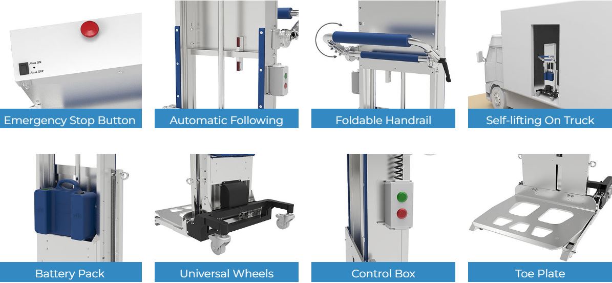 XSTO LFT260 semi-electric forklift is an efficient mini lifting equipment with 1 meter lifting height that can lift goods up to 260 kg and lift onto a platform or truck. Equipped with a function, it can automatically adjust the height according to the position of the load, which reduces the number of bends during the handling process. Widely used in logistics, material handling, food and beverage handling, warehouse, factory, etc.